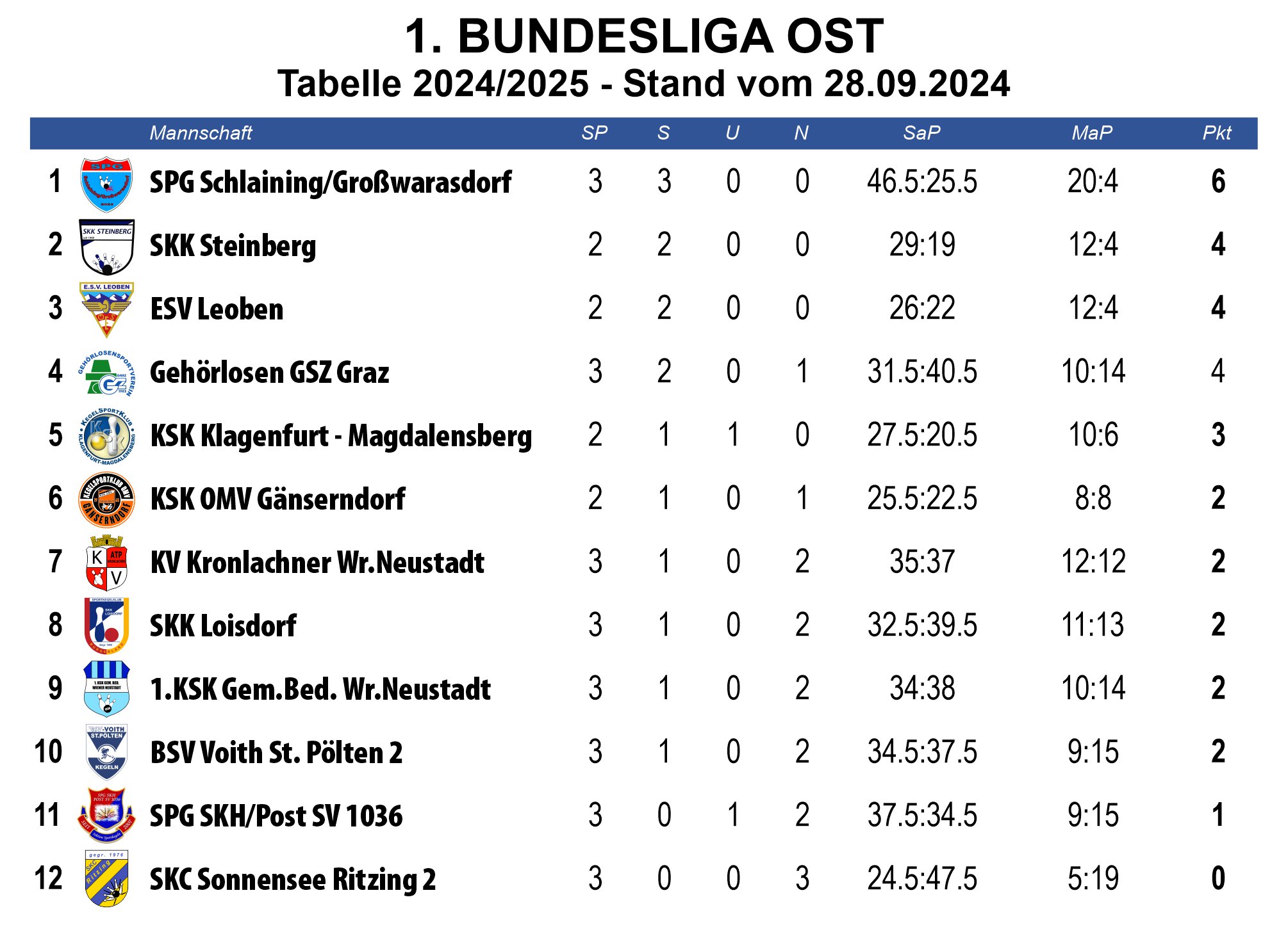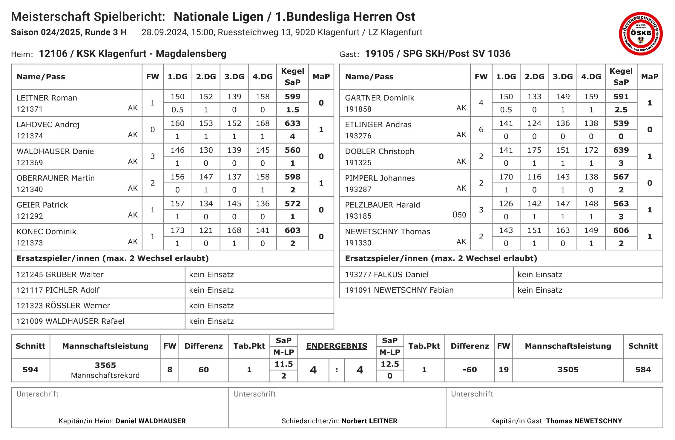 In einem hochspannenden Spiel bei toller Stimmung und sehr guten Leistungen auf beiden Seiten war das Glück diesmal nicht unbedingt auf Seiten der Kärntner. Die Big-Points gingen meist an die Wiener, war aber auch teils selbstverschuldet. So mussten sich im ersten Umlauf Roman Leitner (KSK, 599 Kegel) gegen Dominik Gartner (SPG, 591 Kegel) mit 1,5:2,5 Satzpunkten trotz mehr Gesamtkegel geschlagen geben, hier entschied der letzte Wurf zugunsten des Wieners. Andrej Lahovec (KSK) hatte hingegen ein leichtes Spiel und entschied sein Duell gegen Andras Etlinger mit 4:0 Sätzen bei starken 633 Kegel klar für sich. KSK-Kapitän Daniel Waldhauser war im dritten Duell des ersten Umlaufes mit 560 Kegel gegen den Tagesbesten Christoph Dobler, der starke 639 Kegel erzielte, chancenlos. Im zweiten Umlauf spielten für den KSK Martin Oberrauner gegen Johannes Pimperl, Patrick Geier gegen Harald Pelzlbauer und Dominik Konec gegen Thomas Newetschny. Patrick Geier (572 Kegel) musste sich, wie schon Roman Leitner, mit mehr Gesamtkegel, geschlagen geben. Da dann auch noch Dominik Konec mit 603:606 Kegel gegen Thomas Newetschny (zwei Naturneuner bei den letzten Würfen) das Nachsehen hatte, blieb es an Martin Oberrauner (598 Kegel) zumindest das Remis zu sichern. Die Wiener boten mit 3505 Kegel auch eine sehr starke Mannschaftsleistung, da musste sich der KSK Klagenfurt-Magdalensberg strecken, erzielte aber selbst mit 3565 Kegel (594 Schnitt) neuem Heim-Mannschaftsrekord, was auch zeigt, dass die Mannschaft auf einem guten Weg ist.