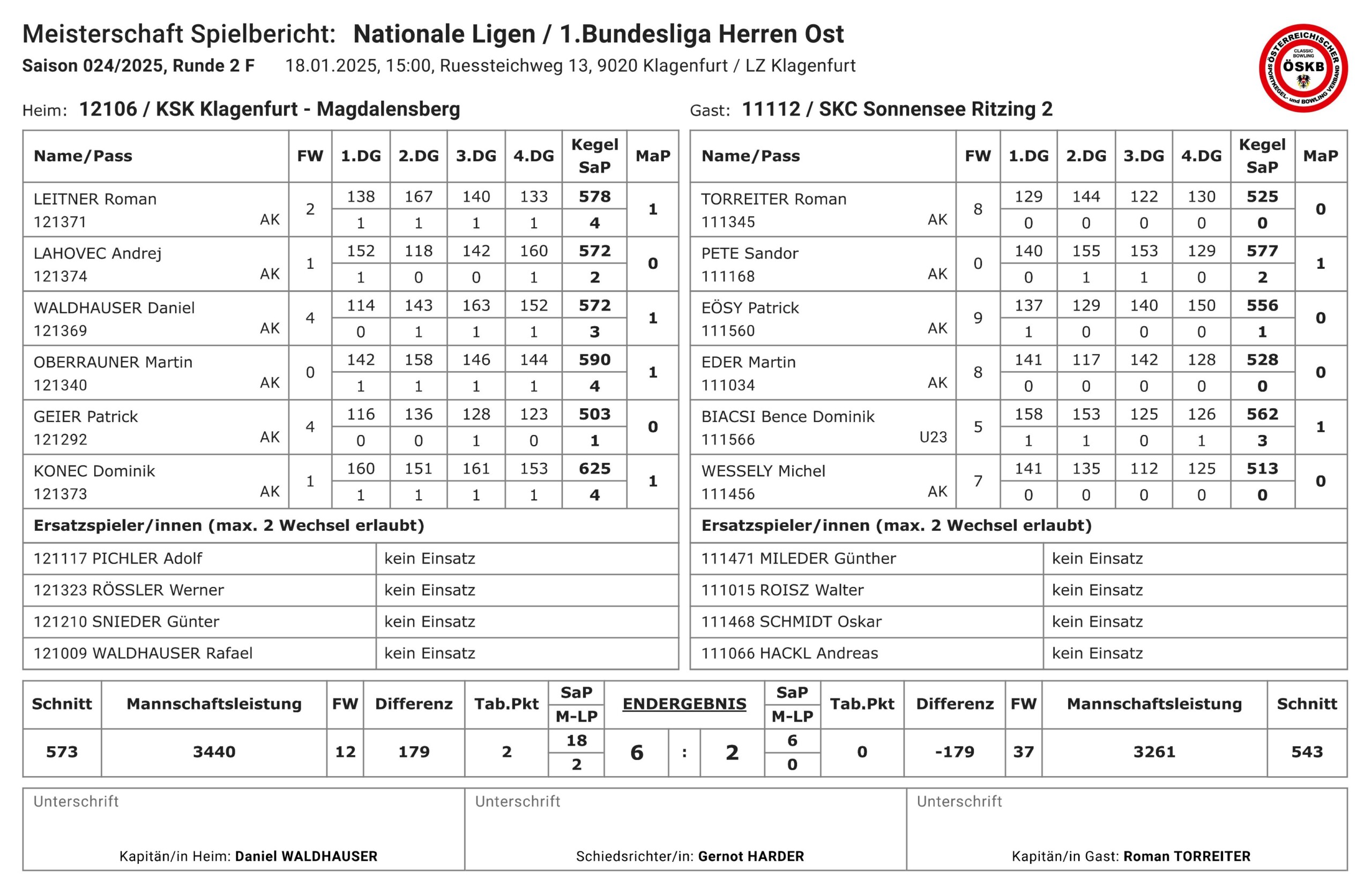 Im ersten Frühjahres-Heimspiel gelang dem KSK Klagenfurt-Magdalensberg ein letztendlich klarer 6:2 Heimerfolg über die burgenländische Mannschaft SKC Sonnensee Ritzing 2. Die Kärntner starteten im ersten Durchgang mit Roman Leitner, Andrej Lahovec und Mannschaftskapitän Daniel Waldhauser. Während Roman Leitner wenig Probleme hatte, und sein Spiel klar mit 4:0 Sätzen und 578:525 Kegel gewann, hatte Andrej Lahovec nach guter Startbahn einen Durchhänger, kämpfte sich zwar zurück, musste sich aber dem besten Burgenländer, Sandor Pete, bei Satzgleichstand knapp mit 572:577 Kegel geschlagen geben. Daniel Waldhauser steigerte sich nach schwacher Startbahn und holte mit 572:556 und 3:1 Sätzen den zweiten Einzelpunkt für den KSK. Zur Halbzeit führten die Kärntner somit 2:1 bei einem Plus von 64 Kegel. Im zweiten Umlauf dominierten die KSK-Spieler Martin Oberrauner mit 590 Kegel und Dominik Konec mit der Tagesbestleistung von starken 625 Kegel ihre Gegenspieler klar und gewannen jeweils mit 4:0 Sätzen. Da war es dann auch nicht weiter tragisch, dass auf Kärntner Seite Patrick Geier einen rabenschwarzen Tag erwischte und sich deutlich geschlagen geben musste.