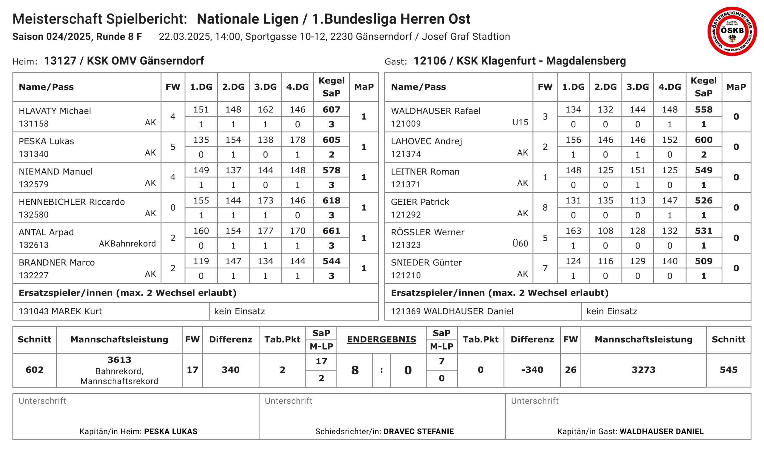 Endstand: 8:0 bei 17:7 Satzpunkten und 3613:3273 Kegel für den KSK OMV Gänserndorf.
