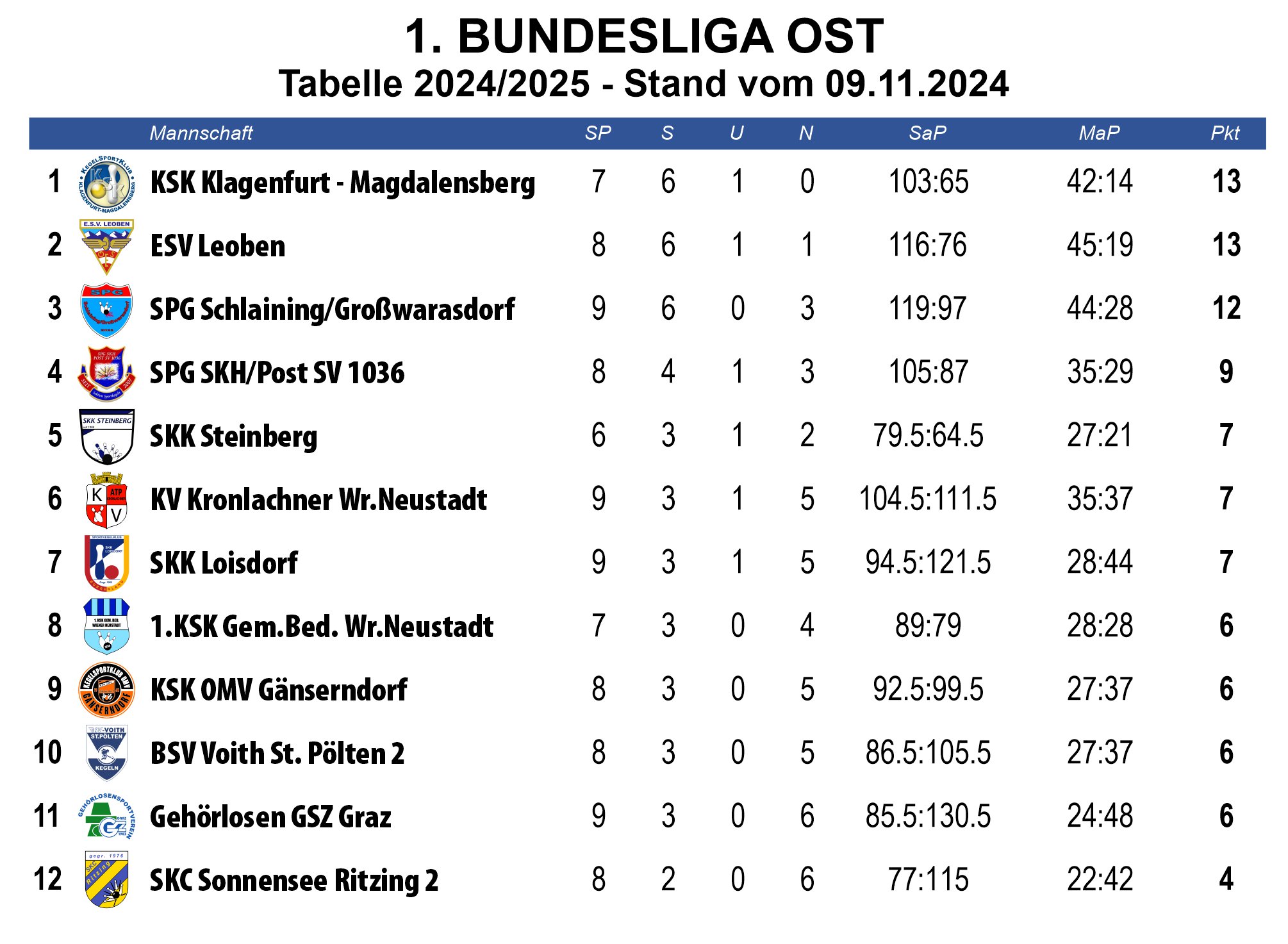 Dank eines 7:1 Heimerfolges über die BSV Voith St. Pölten II bei gleichzeitiger Niederlage des ESV Leoben konnte unser KSK Klagenfurt-Magdalensberg bereits vor dem direkten Duell mit Leoben den Herbstmeistertitel fixieren. Im Spiel selbst starteten die Niederösterreicher enorm stark und gewannen jeweils ihre Startbahnen. Die KSK`ler blieben aber unbeeindruckt und nutzen ihre Gelegenheiten. So konnte Andrej Lahovec mit 578:564 Kegel und Teamkapitän Daniel Waldhauser mit 561:560 Kegel jeweils bei Satzgleichstand ihre Einzelpunkte gewinnen. Lediglich Roman Leitner musste mit 582:587 Kegel gegen den besten St. Pöltner, Christoph Lechner, knapp den Punkt abgeben. Zwischenstand 2:1 bei +10 Kegel. Im zweiten Umlauf ließen dann Martin Oberrauner mit 582 Kegel, Youngster Rafael Waldhauser (U-15 Spieler) mit 583 Kegel und Dominik Konec mit 588 Kegel nichts mehr anbrennen, gewannen ihre Spiele recht deutlich und fixierten den 7:1 Endstand und somit auch den Herbstmeistertitel. Einmal mehr war die mannschaftliche Geschlossenheit der Kärntner der Schlüssel zum Erfolg.