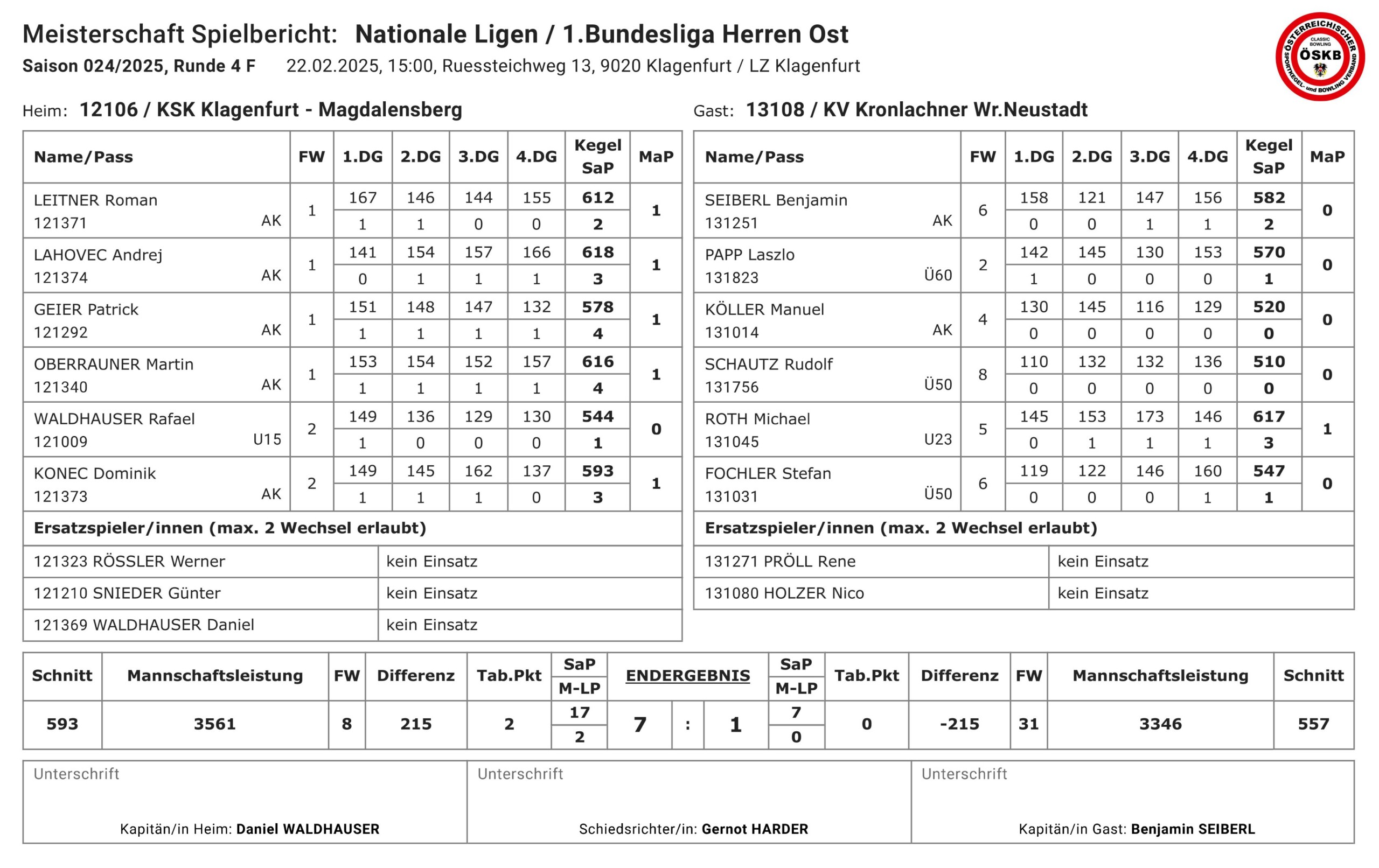 Mit einer erneut starken Mannschaftsleistung von 3561 Kegel (593,5 Schnittkegel) ließ der KSK Klagenfurt-Magdalensberg auch gegen KV Kronlachner Wr. Neustadt wenig zu und blieb nur 4 Kegel unter der Heim-Bestleistung. Andrej Lahovec erzielte mit 618 Kegel die Tagesbestleistung, aber auch Martin Oberrauner mit 616 Kegel und Roman Leitner mit 612 Kegel, überspielten die 600er-Marke und punkteten für den KSK. Dominik Konec mit 593 Kegel und Patrick Geier mit 578 Kegel holten die weiteren Einzelpunkte der Heimmannschaft. Lediglich Youngster Rafael Waldhauser konnte diesmal mit 544 Kegel nicht ganz mithalten. Allerdings erzielte sein Gegenspieler, Michael Roth, starke 617 Kegel und somit die beste Leistung der Niederösterreicher. Dank dieser durchwegs sehr guten Leistungen standen am Ende +215 Kegel und ein 7:1 Erfolg für den KSK auf der Anzeige.