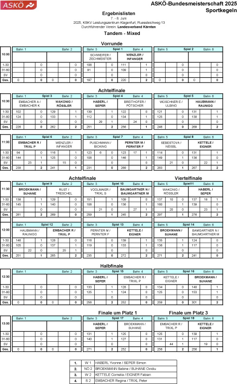 Im Tandem-Mixed Bewerb am Sonntag war Kärnten mit zwei Paaren vertreten. Während für Beate Puschmann & Rupert Bicking (beide BSG Ktn. Landesregierung) bereit in der ersten Runde das Aus kam, war für Barbara Wakonig & Werner Rössler, trotz bester Gesamtzahl, nach zweimaligen Sudden Victory, im Viertelfinale Endstation.