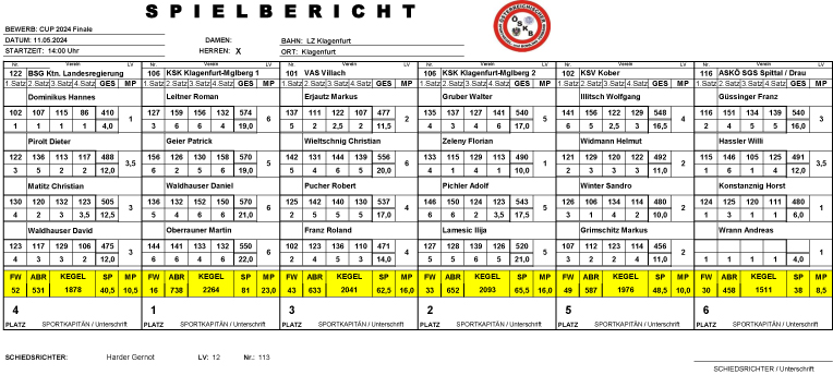 Im Finale des Kärntner Cups war der KSK Klagenfurt-Magdalensberg eine Klasse für sich und gewann mit 23 von 24 möglichen Mannschaftspunkten souverän. Roman Leitner mit der Tagesbestleistung von 574 Kegel, Patrick Geier und Daniel Waldhauser mit je 570 Kegel sowie Martin Oberrauner mit 550 Kegel, ließen nichts anbrennen. Eng wurde es im Kampf um Silber und Bronze – bei Gleichstand an Mannschaftspunkten wurden die Satzpunkte entscheidend, und hier hatte die zweite Mannschaft des KSK Klagenfurt-Magdalensberg mit 65,5 zu 62,5 Satzpunkten gegenüber VAS Villach die Nase vorne. Die Siegermannschaft vertritt Ende Juni beim Österreich-Cup in Vorarlberg die Kärntner Farben.