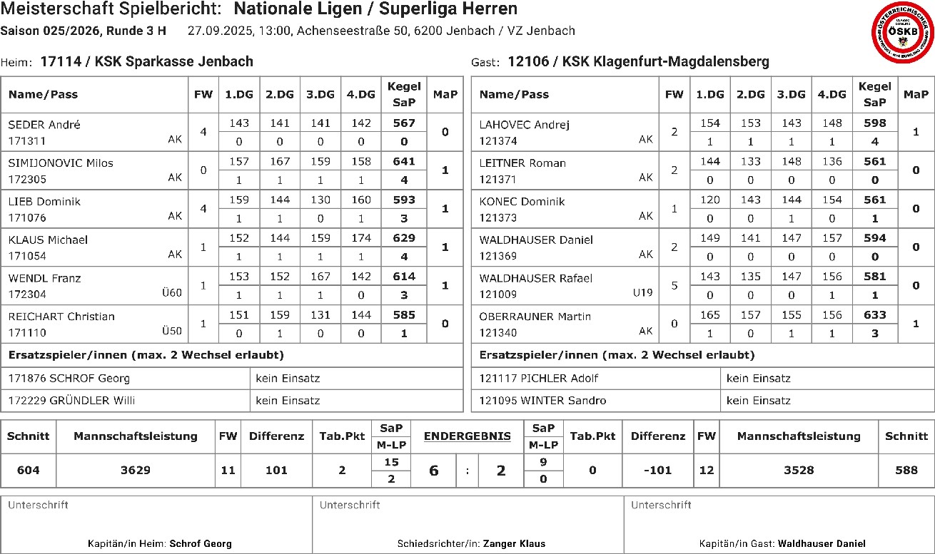 Endstand: 6:2 Mannschaftspunkte bei 15:9 Satzpunkten und 3629:3528 Kegel für den KSK Sparkasse Jenbach