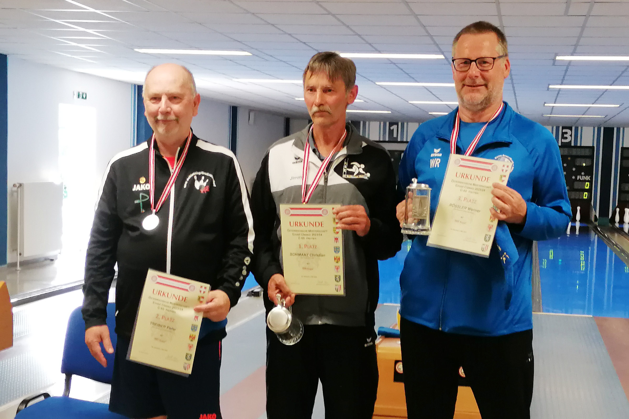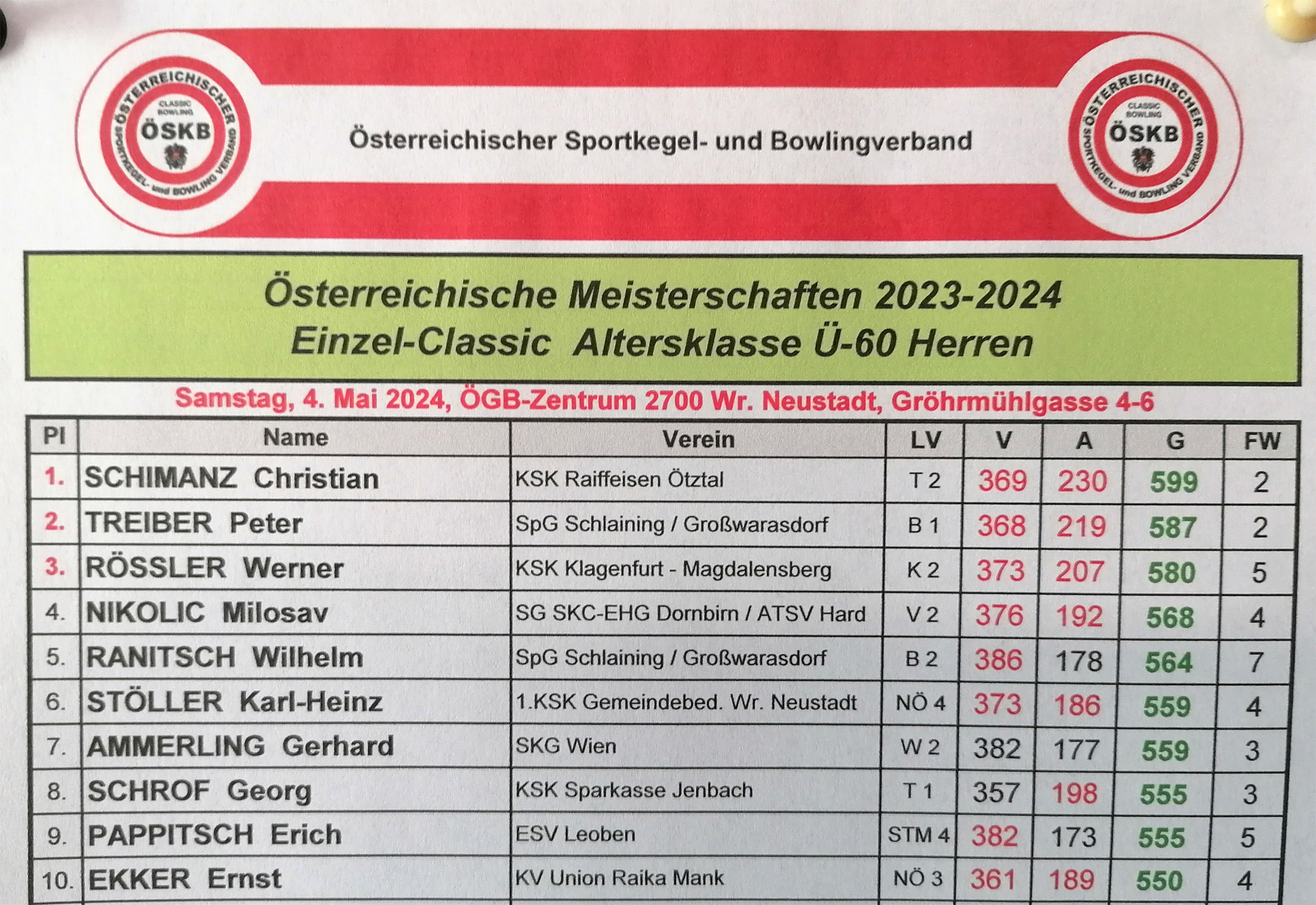 Bei der Österreichischen Meisterschaft Einzel Classic in der Altersklasse Ü-60 konnte Werner RÖSSLER, Obmann des KSK Klagenfurt-Magdalensberg, mit der sehr guten Leistung von 580 Kegel den dritten Rang und somit die Bronzemedaille erkegeln. Auf den Bahnen im ÖGB-Zentrum Wr. Neustadt (NÖ) musste sich Werner nur dem Burgenländer, Peter Treiber (SPG Schlaining/Großwarasdorf) und dem Tiroler, Christian Schimanz (KSK Raiffeisen Ötztal), geschlagen geben.