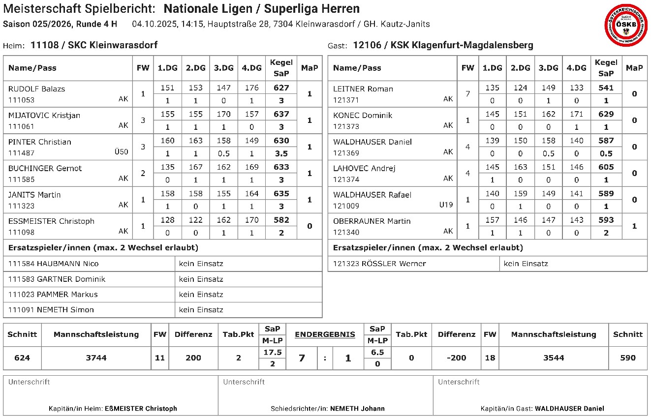 Nichts zu holen war für den KSK Klagenfurt-Magdalensberg im Superliga-Auswärtsspiel beim SKC Kleinwarasdorf. Die Burgenländer, aktuell Tabellenzweiter, brillierten mit einer geschlossenen Mannschaftsleistung bei einem Schnitt von 624 Kegel. Eine Leistung, an die nur ein KSK-Spieler rankam – Dominik Konec mit 629 Kegel. Aber das war gegen den Tagesbesten, Kristjan »Kiki« Mijatovic, der 637 Kegel spielte, trotzdem zu wenig. Detail am Rande: Kiki Mijatovic ist sonst Trainingspartner der KSK´ler und Wirt der Sportbar im Leistungszentrum Klagenfurt, er reiste sogar gemeinsam mit den Kärntnern an, ließ aber im Spiel keine Gnade walten. Aber auch die anderen Spieler der Kleinwarasdorfer waren mit Ergebnissen zwischen 627 und 635 Kegel auf gleichem Level. Lediglich Christoph Essmeister fiel etwas ab, was Martin Oberrauner mit 593:582 Kegel zum Ehrenpunkt des KSK ausnützte.