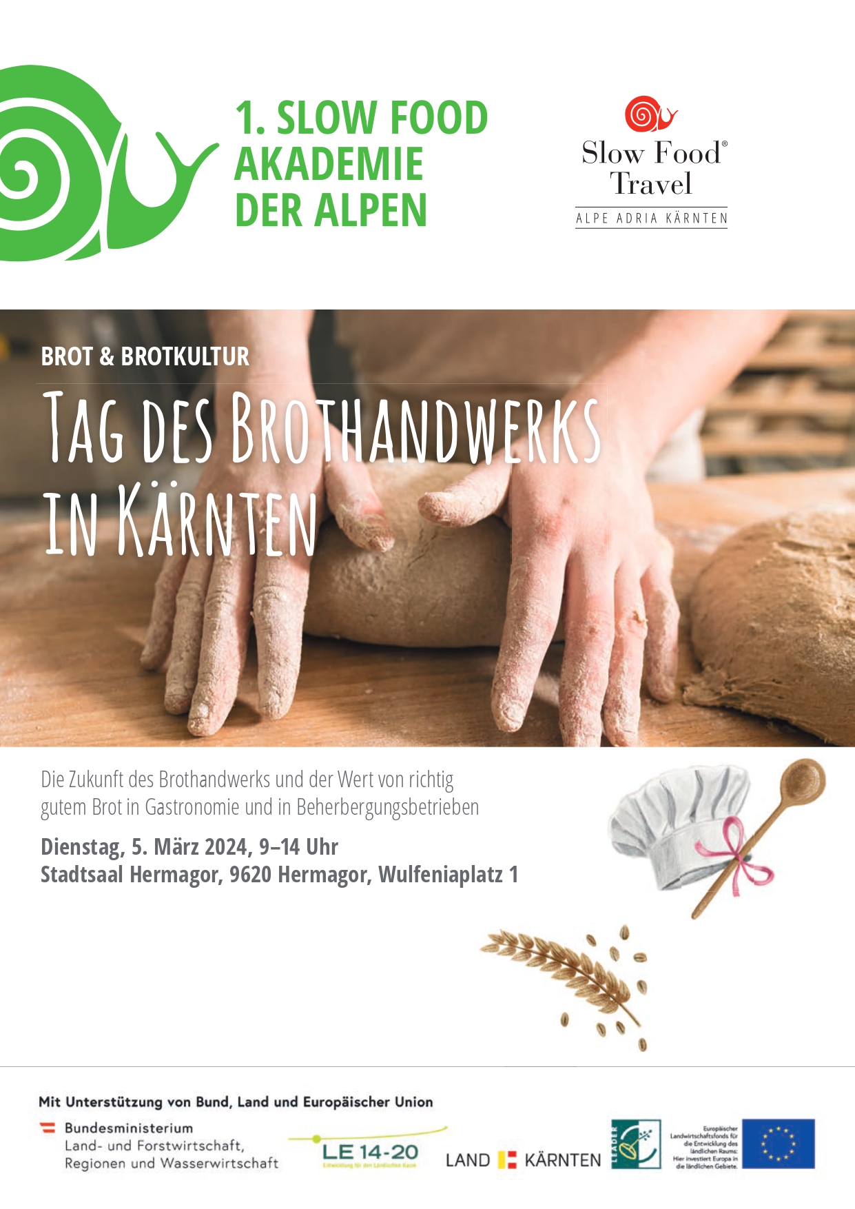 Am 5. März 2024 lädt die 1. Slow Food Akademie der Alpen zum „Tag des Brothandwerks“ in den Stadtsaal Hermagor ein. Unter dem Motto „Die Zukunft des Brothandwerks und der Wert von richtig gutem Brot in der Gastronomie“ steht die Bedeutung von Brot in unserer Gesellschaft im Mittelpunkt.