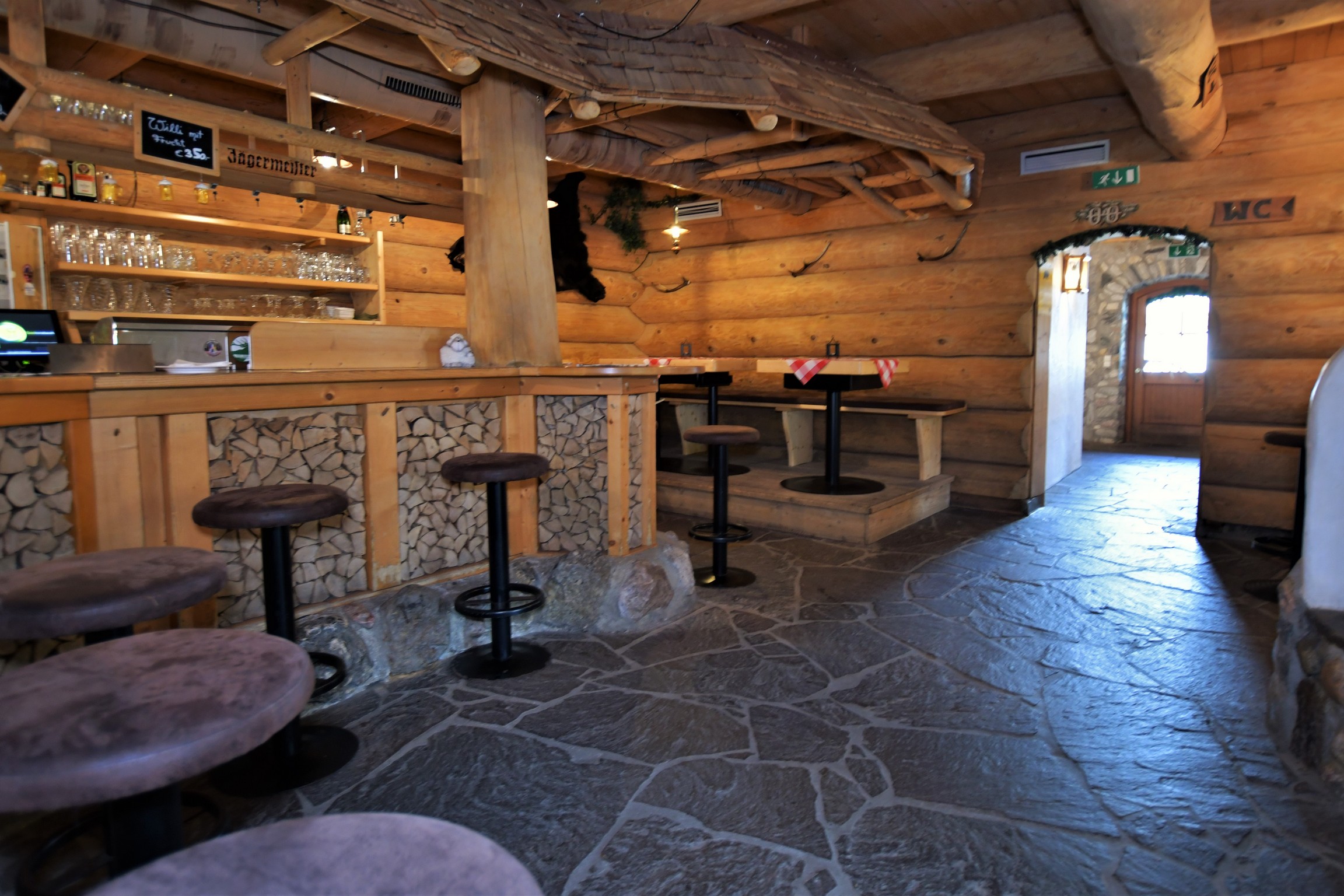 Die fichtenen Sitzgruppen in der bewirteten Holzhütte verleihen dem Gasthaus ein typisches Hüttenflair.